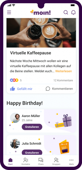 Rundmails, Aushänge oder WhatsApp - up to date zu sein war bisher nicht einfach für Ihre Mitarbeitenden. Mit moin! ändern wir das. Informiert eure Mitarbeitenden im Handumdrehen über neue Kunden, aktuelle Kennzahlen, Schichtplanänderungen und Produkt-Neuigkeiten. Die Corona-Krise hat gezeigt, dass Mitarbeitende Updates in kürzeren Intervallen brauchen.