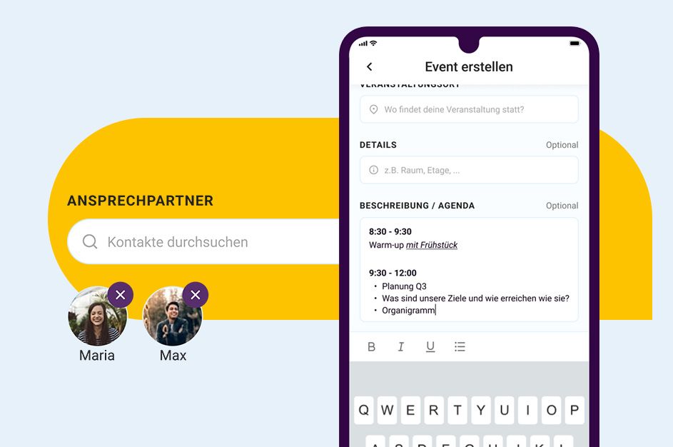 Damit aufkommende Fragen zu einem anstehenden Event nicht unbeantwortet bleiben, benötigt es manchmal mehr als eine Kontaktperson. moin! ermöglicht das jetzt. Bei jeder Veranstaltung können die Ersteller:innen direkt mehrere Ansprechpartner:innen für das Event auswählen. Diese können themenspezifische Fragen schneller beantworten, wenn einzelne Personen verhindert sind.