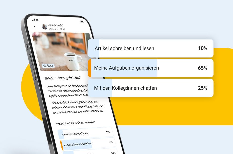Wo soll der Teamabend stattfinden? Welche Weiterbildungsangebote wünscht ihr euch? Wer Fragen wie diese klären möchte, nutzt die Umfrage-Funktion in moin!. Durch das Update ist sie noch nutzerfreundlicher. Wer die Umfrage erstellt, kann nun auch Zwischen-Ergebnisse einsehen, ohne selber teilzunehmen. Das bewahrt ein unverzerrtes Ergebnis und beschert mehr Planungssicherheit.